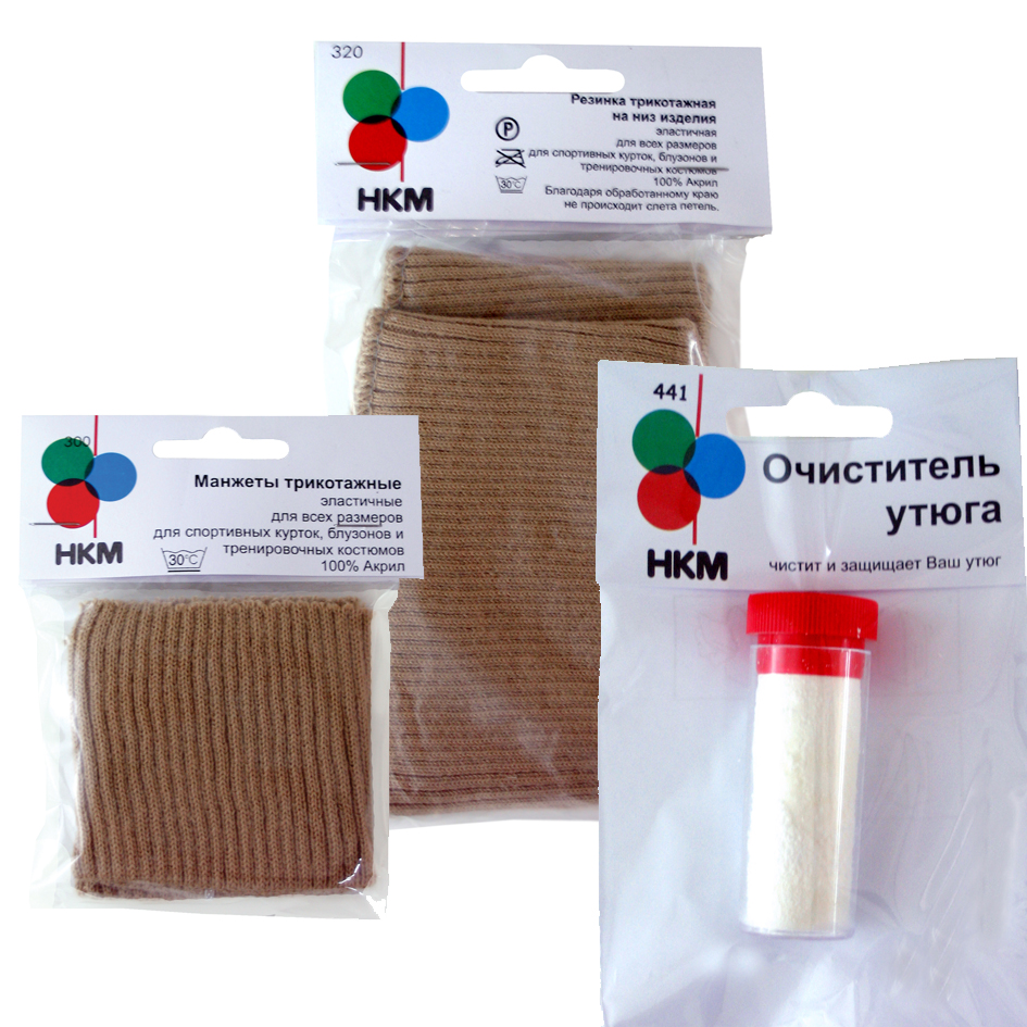 6. HKM предлагает также ассортимент трикотажных манжет и резинок на низ изделия,клеевую липучку, карандаш-очиститель для утюга, перфоленту и клеевую липучку для по-